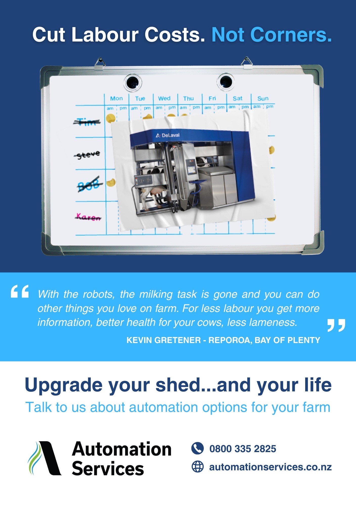 Here's the Solution. New Zealand's dairy industry faces an unprecedented labour crisis. Finding reliable staff is harder than ever, and wage costs continue to climb. For many farmers, rostering has become more stressful than the actual farming. At Automation Services , we specialise in technology that directly addresses your biggest overhead: labour. Read their story here.
